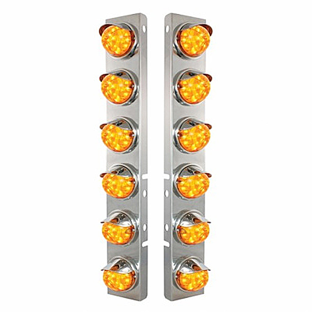 United Pacific - Stainless Steel Front Air Cleaner Bracket With 12X 17 LED Dual Function Watermelon Lights & Stainless Steel Visors For Peterbilt - Amber LEDs (Amber or Clear Lens)